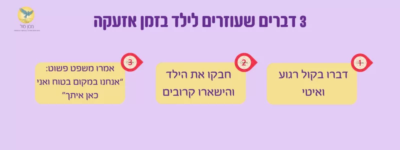 כאשר נשמעת אזעקה והילד נבהל, כמה פעולות פשוטות של ההורה יכולות להרגיע אותו במהירות: