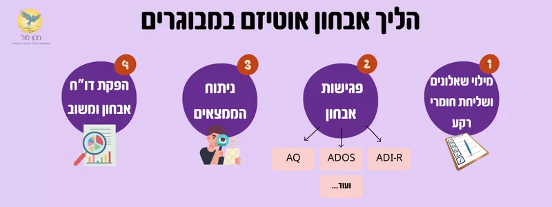 לאחר מכן, הפסיכולוג יעביר מבחנים פסיכולוגים, ביניהם ADOS מודול 4 למבוגרים וינתח שאלונים שבודקים תסמיני אוטיזם, כמו שאלון AQ ושאלונים שבודקים יכולת הסתגלות/תפקוד, שהועברו טרם האבחון למאובחן.