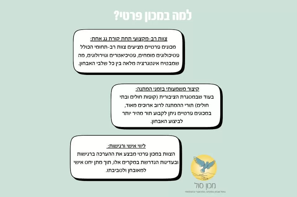 לעניין זה יתרון רב, שכן הפונה/מאובחן, מקבל מעטפת רחבה לצרכיו ואנשי המקצוע המאבחנים והמטפלים, יכולים לעמוד בקשר האחד עם השני. כך, ניתן במכון האבחון הפרטי להתרשם מהתוכנית הטיפולית המוצעת להם. כך יוכלו ההורים לדייק עוד יותר את צרכיו של ילדם.